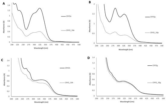 16]. The reference extract “oxidation free” (CRYO) was prepared by adding the hydro-alcoholic solution to the ground material immediately after grinding. A second extract “oxidized sample” (CRYO_30) was instead prepared by adding the solvent to the ground material only after 30 min, during which the ground plant was left in contact with air to oxidize. For each extract, 15 g of ground material was weighted after grinding and macerated with ethanol 86% (