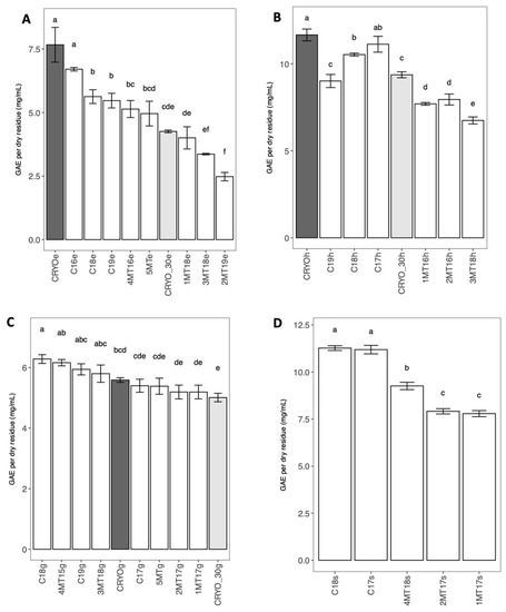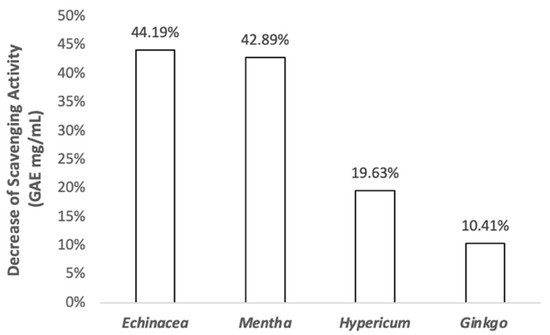 Moreover, it is important to underline that not every plant has the same level of sensitivity to the oxidation process. The results show that the MTs obtained in the oxidation stress test over 30 min of air exposure showed a decrease in scavenging activity (expressed as GAE), which is more pronounced in