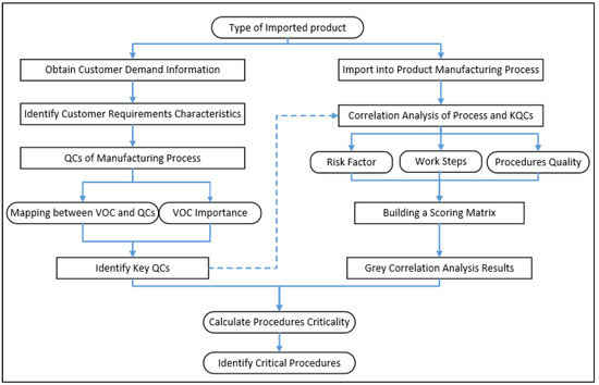 The article explains the specific operation process through an enterprise case. According to the final results, the method in the article is feasible, and the results have been affirmed by enterprise managers. Therefore, under the background of product diversification, this study can not only grasp information regarding customer requirements but can also produce products that meet customer requirements based on this information. In addition, identifying critical procedure can better help the manufacturing industry reduce the economic losses caused by the out-of-control process. To reflect the idea of the article, the flow structure of the article is especially drawn, as shown in Figure 1.