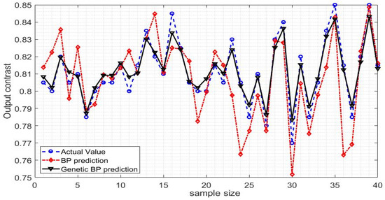 This study uses three layers of genetic BP neural network structure. The number of input layer neurons is 10, and the number of output layer neurons is 1. However, the number of neurons in the hidden layer cannot be given directly, so we need to determine the value range according to the empirical formula [38,39], which is . Where, n is the number of neurons in input layer, q is the number of neurons in the output layer, and a is the constant with a value range of (1, 10). Therefore, the number of neurons in the hidden layer ranges from 4 < m < 13. Through the simulation experiment, we determine that when m = 7, the genetic BP neural network can achieve the best fitting accuracy. The momentum factor is 0.8, and the learning rate is 0.1. The initial weights and thresholds were optimized by a genetic algorithm with a total size of 80 and 100 iterations. Training samples are used to train the genetic BP neural network. The comparison of training accuracy is shown in Figure 5, and the sample size is 40 groups.