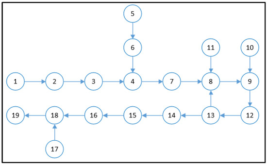 In this section, we will compare the methods in reference [40]. This method belongs to the analysis of problems from the perspective of the manufacturing process. It takes graph theory as the model and determines the critical procedure by constructing the influence degree calculation formula and the unqualified degree calculation formula. With product processing technology as the background, the directional graph model of procedure nodes is drawn, as shown in Figure 7. The above data was used to apply the literature method, and the results were calculated and compared with the results in this paper, as shown in Figure 8.