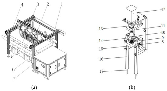 General and partial diagrams. (a) Overall construction of the seedling-picking device. (b) Seedling pick-up mechanism. (1) Translation module, (2) seedling-collection mechanism, (3) seedling tray conveyor belt, (4) frame, (5) bowl seedling tray, (6) connecting seedling cup, (7) control cabinet, (8) intermediate linkage, (9) screw, (10) screw nut, (11) upper bearing housing, (12) closed loop stepper motor, (13) coupling, (14) nut, (15) lower bearing housing, (16) swivel rod, and (17) seedling pin.