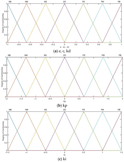 As can be seen from Figure 2, in the fuzzy PID control system, deviation e and deviation change rate ec were taken as input variables [20], and Δkp, Δki and Δkd were taken as the output of the fuzzy controller after fuzzification, fuzzy reasoning, and inverse fuzzification. Before fuzzification, the number of elements in the fuzzy set of each input variable should be determined to provide a basis for the subsequent fuzzification and the formulation of fuzzy rules [21]. The fuzzy sets of e, ec, Δkp, Δki and Δkd had 7 grades {−3, −2, −1, 0, 1, 2, 3}, and the corresponding language variables were {negative big (NB), negative medium (NM), negative small (NS), zero (ZO), positive small (PS), positive median (PM), positive big (PB)}. The physical theoretical domain of the motor angular velocity deviation e was [−20/11, 20/11]; the physical theoretical domain of ec was [–100, 100]; and the physical theoretical domain of fuzzy controller outputs Δkp, Δki and Δkd were [−1.6, 1.6], [−0.7, 0.7], and [−0.1, 0.1] respectively. The corresponding language variables were KP, KI and KD. According to the above conditions, trapezoidal membership function curves were used for input language variables E and EC, and their discrete theory domains were [–1, 1] and [−1, 1] respectively. Trapezoidal and membership function curves were also used for output language variables KP, KI and KD, and their corresponding discrete theory domains were [–2, 2], [−1.5, 1.5], and [–1, 1] respectively; the membership function curve is shown in Figure 3. The quantization factor k and the scale factor A are