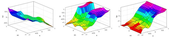 Based on the input and output of the membership function of the fuzzy PID controller above, the fuzzy control rules [24], and other relevant parameter sets, the output surface of the approximate correction of the PID’s proportional coefficient, integral coefficient, and differential coefficient was obtained, as shown in Figure 4