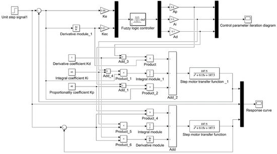 The offline adjustment of fixed PID control parameters through the MATLAB/Simulink functional module can improve the design efficiency of the control system to a greater extent [27], and the adjusted PID control parameters kp, ki and kd were determined to be 46, 45, and 1 respectively. After the fuzzy controller was established in the MATLAB/Fuzzy toolbox with the PID control system in Simulink to build the system simulation model of adaptive fuzzy PID control stepper motor, the system simulation model plot shown in Figure 5 was obtained, and the response curve plot shown in Figure 6 was obtained with the unit step as the input excitation.