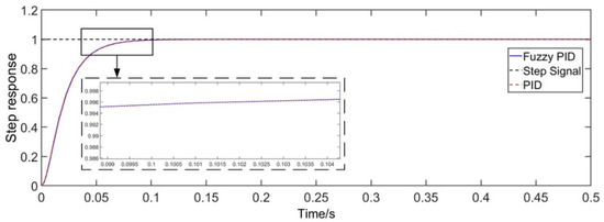 Figure 6 shows that two kinds of control system of the unit step response curve were no overshoot and no steady-state error, but from the response curve, at the same time, the fuzzy PID response curves were in the upper part of the traditional PID response curve; therefore, the fuzzy PID’s response speed is faster than the traditional PID control system; in addition, the simulation results show that the unit step response time of the PID control system to the steady state was 0.152 s, and the unit step response time of the fuzzy PID control system to the steady state was 0.145 s. Compared with the PID control system, the response time of the PID control system to the steady state was shortened by 4.605%. In conclusion, compared with the PID control system, the fuzzy PID control system had a faster unit step response speed, so the control performance of the system was better.