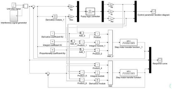 (2) The simulation model of the stepper motor rotor angular velocity control system based on fuzzy PID control and traditional PID control was built in MATLAB/Simulink. The unit step response results show that the time the fuzzy PID control system took to reach the steady state was 0.145s, and the time the traditional PID control algorithm took to reach the steady state was 0.152s. The time the fuzzy PID control system took to reach the steady state was shortened by 4.61% compared with the time the traditional PID control system took to reach the steady state. In addition, on the basis of the unit step signal as an excitation signal, six groups of interference signals with different frequencies were added in the same time period. The response results show that after adding interference signals with frequencies of 3 Hz, 10 Hz, 20 Hz, 30 Hz, 40 Hz, and 50Hz, compared with the PID control algorithm, the time the fuzzy PID control algorithm took to reach the steady state was shortened by 0.318%, 5.619%, 16.526%, 6.157%, 6.936%, and 7.277%, respectively. Therefore, the simulation results show that the fuzzy PID control is more stable than the traditional PID control, and the dynamic control performance is better.