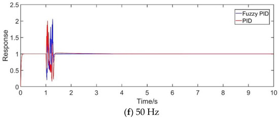 It can be seen from Figure 8 and Table 3 that the response curves between the fuzzy PID control system and the PID control system almost overlap after the addition of 3 Hz interference signal. However, the time for the fuzzy PID control system to reach the steady state was shortened by 0.318% compared with that of the PID control system. After the interference signal with a frequency of 10 Hz was added, the response of the fuzzy PID control system showed no overshoot, while the response of the PID control system showed a large overshoot in a short time. In addition, the time of the former to the steady state was shortened by 5.619% compared with the latter. After the interference signal with a frequency of 20Hz was added, the fuzzy PID control system had a large overshoot in a short period of time compared with the PID control system. In the rest of the time, the fluctuation range of the response of the fuzzy PID control system to interference was smaller than that of the PID control system. Moreover, the response time of the fuzzy PID control system needed to reach the steady state was shortened by 16.526% when the PID control system was in a steady state. After the interference signals of 30 Hz and 40 Hz were added, the oscillation frequency of the PID control system was higher than that of the fuzzy PID control system. The time taken to reach the steady state increased by 6.157% and 6.936%, respectively. After the interference signal with a frequency of 50 Hz was added, there was little difference between the response oscillations of the two, but the response of the fuzzy PID control system to the steady state was equal to a 7.227% shorter time. Therefore, according to the simulation results, compared with the PID control system, the fuzzy PID control system had stronger stability and better ability to resist interference in the face of external vibration interference, so it was also more suitable for the field work environment.