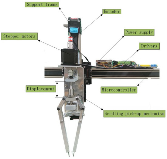 - Hu, J.P.; Chang, H.; Yang, L.H.; Han, L.H.; Mao, H.P.; Zhang, S.W. Design and experiment of control system for automatic transplanter picking up and spacing casting whole row of seedlings. Trans. Chin. Soc. Agric. Mach. 2018, 49, 78–84. [Google Scholar]