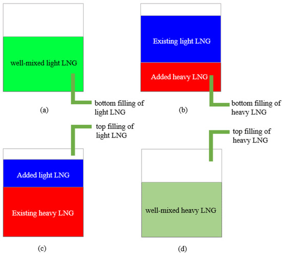 The increased demand for LNG has contributed to the multiplication of production sites and the innovation of production processes, as well as to the diversification of LNG composition and density [16,17,18]. However, there are clear requirements for the composition of the gas produced from the natural gas source, and according to the European standard EN 1160, LNG should have a methane content of more than 75% and a nitrogen content of less than 5% [19,20,21]. In order to give full play to the utilization value of the available facilities [22], the storage of LNG from different sources in the same storage tank could be considered [23,24]. However, due to the different properties of the constituent LNGs, instability can occur when they are mixed for storage, which can lead to major safety concerns and accidents. Hundreds of such incidents have been reported over the last 50 years, but this number is still underestimated [25,26,27]. It is therefore vital that LNG instability incidents are fully investigated to ensure their safe storage.