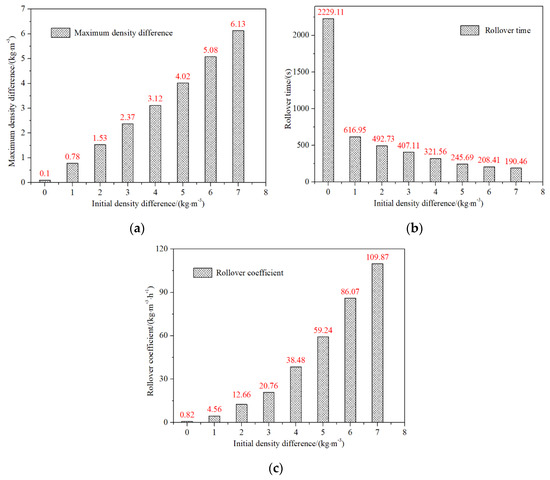 Relation of maximum density difference, rollover time, and rollover coefficient of the storage tank with initial density difference. (a) Maximum density difference; (b) rollover time; (c) rollover coefficient. This figure is adapted from [74].