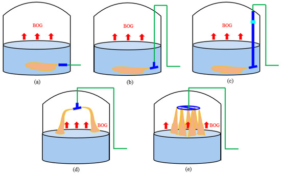 When filling LNG liquid, the appropriate filling method should be selected according to the density difference between the liquid being filled and the residual liquid in the storage tank [90]. When the liquid filled is close to the density of the residual liquid, the bottom filling should be selected. When the density of the filling liquid is significantly greater than the residual liquid in the tank, the top filling should be recommended [91,92]. When the density of the filling liquid is significantly less than the residual liquid in the tank, the bottom filling should be used. Koyama et al. [93] investigated the process of filling storage tanks with LNG of different densities using a numerical model and concluded that the density difference caused by different filling methods could lead to potential stratification. It is worth noting that the filling rate of LNG storage tanks cannot be too large or too small, and the optimal filling volume should be chosen as much as possible to make full use of the tank volume for storage and to have a longer safe storage time, hence gaining more flexible operation time for full station operation. The following forms of LNG filling equipment are commonly used, as shown in Figure 8 [94]. For injecting less dense LNG liquids, the bottom horizontal radial-fill equipment and bottom T-fill equipment were more suitable, and they both injected lighter LNG liquids into the tank from the bottom, which could make the light LNG mix evenly with the existing LNG in the tank, and can reduce the occurrence of the rollover phenomenon. For injecting denser LNG liquids, it was more beneficial to choose top T-fill equipment and top ring-fill equipment, both of which injected the heavy LNG liquid on top of the existing LNG in the tank so that the two types of LNG could be mixed evenly. The occurrence of a rollover accident was effectively avoided.