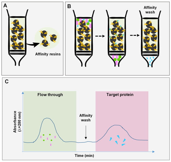 Schematic representation of affinity chromatography. (A) The affinity resins (i.e., agarose) that binds the molecule of interest and (B) the separation process, which includes an equilibration step (using Tris-HCl or sodium acetate) followed by the elution (using Tris-HCL/Glycine-HCl, PBS). (C) A typical chromatogram of affinity chromatography with the first flow through containing only molecules with no affinity to the matrix, which is followed by affinity wash to disrupt the interaction between the matrix and the target protein and elute the latter.