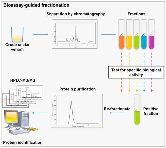 Schematic representation of bioassay-guided fractionation, crude venom is separated using a chromatographic technique; then, fractions are assessed using a specified biological assay to choose the corresponding fraction. This step could be repeated several times until we reach a single peak or a pure molecule that could be identified by MS.