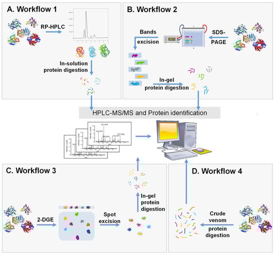 The first workflow (Figure 4A) involves the separation of venom mixture with RP-HPLC using a stepwise or linear acetonitrile gradient. This step is followed by an in-solution trypsin digestion of fractions and LC-MS/MS. Prior to digestion, collected fractions can be tested using SDS-PAGE to evaluate the distribution of proteins in each fraction regarding the MW and number of protein bands. This technique was extensively used in the venomics field to reveal the proteomic composition of SVs such as Bungarus sindanus, Calliophis intestinalis, Deinagkistrodon acutus, Trimeresurus wiroti, Trimeresurus puniceus, and Hydrophis curtus [100,101,102,103,104,105]. This technique was also used in several studies to compare the variability between different SVs [106].