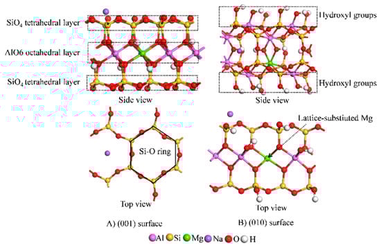 Montmorillonite and other clay minerals have been used as adsorption materials due to their low cost, easy access, large specific surface area, and strong surface charge []. Currently, adsorbent materials are mainly obtained by changing their particle size or composition. For example, Song et al. [,] reported the synthesis of chitosan-2D montmorillonite with good adsorption properties for Pb2+ by the stripping and modification of montmorillonite. Yin et al. [] investigated the removal of Pb2+ from aqueous solutions by nano illite/smectite clay and revealed that the adsorption patterns followed the Langmuir adsorption isotherm models. The adsorption process was endothermic, and Pb2+ was removed by 99.45%. Chen et al. [] reported the synthesis of a waste-paper montmorillonite composite aerogel to adsorb Cd2+ by ambient pressure drying technology followed by modification with NaOH or H2O2, and the NaOH-modified aerogel revealed a maximum adsorption capacity of 232.5 mg/g. In most of the studies, montmorillonite adsorption of heavy metal ions has been investigated on the macroscopic level; only a limited number of studies have discussed the adsorption mechanisms at the microscopic scale. Recently, density functional theory (DFT) calculations and molecular dynamics (MD) simulations have been employed to understand the ion adsorption mechanism. For example, Min et al. [] investigated the adsorption of Ca(OH)+ on montmorillonite (001) and (010) surfaces by DFT, and the results revealed that the cations were adsorbed on the (001) surface electrostatically and on the (010) surface via hydrogen bonds. Furthermore, Chen et al. [,] concluded via DFT that the selectivity of flotation agents to minerals and ions is related to the symmetry of the molecular orbitals. Peng et al. [,] relied on MD to study the adsorption of NH4+ between montmorillonite layers and found that the interaction of NH4+ and water molecules between these layers were affected by surface lattice substitution, charge, and the content of water stratification. However, DFT has limited accuracy in the presence of a large number of molecules due to the numerous calculations involved. Conversely, MD simulations can be applied to systems with a large number of molecules but cannot explore the mechanism of the chemical bonding.