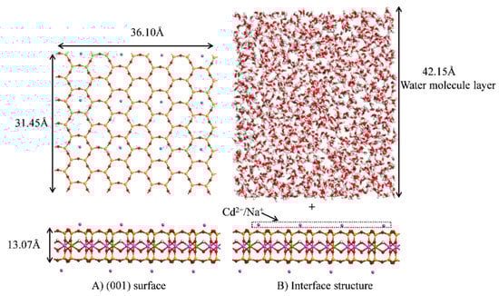 Interactions occur between ions, water molecules, and mineral surfaces at the montmorillonite interface. Consequently, an interface model of montmorillonite was constructed to reveal the adsorption mechanism of Cd2+ (Figure 2). The (001) face of montmorillonite, obtained from a previous DFT model and having the chemical composition Na0.5Al3.5Mg0.5Si8O20(OH)4, was selected. Figure 2A shows the model of the montmorillonite (001) surface with a surface size of 36.10 × 31.45 Å2 and a thickness of 13.07 Å, whereas Figure 2B shows the interface model of montmorillonite. A hydration layer with a thickness of 42.15 Å (1600 water molecules and density of 1 g/cm3) was added in the normal direction of the (001) surface and a vacuum layer of 80 Å was added above the water molecular layer to avoid periodic interactions between the upper and lower layers of the structure. Since Na+ exposed on the (001) surface can undergo exchange adsorption with cations present in the solution [], this study considered the cation exchange capacity (CEC) of Na+ by Cd2+ and CEC was set to 1/3, 2/3, and 1 to investigate the adsorption of cations at the interface.