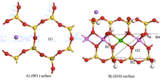 Taking into account the symmetries of the (001) and (010) surfaces and the reactivity of the surface, the initial adsorption sites of Cd2+ on the montmorillonite surface were set (Figure 3). In Figure 3A, the holes above and between the oxygen atoms of the silicon–oxygen ring and oxygen atoms were mainly on the (001) surface with five adsorption sites, mainly T1–T2 and H1–H3. On the montmorillonite (010) surface (Figure 3B), the main influence considered was that of the hydroxyl groups, and the bridge sites B1–B3, top sites T1–T3, and acupuncture points H1–H3 were set. In addition, the configurations of the different initial bits were optimised using DFT (Table 1). Through structural optimisation, the interactions between Cd2+ and the surface atoms caused the adsorption sites to migrate. On the (001) surface, the adsorption energy of Cd2+ ranged from −44.11 to 88.74 kJ/mol. The final adsorption sites were H1 and H3, and the adsorption energy of H3 was −44.11 kJ/mol. The adsorption energy of water molecules on the (001) surface ranged from −24.96 to −62.40 kJ/mol [], and consequently, the adsorption sites of H3 were easily occupied by water molecules. On the (010) surface, the adsorption energy of Cd2+ ranged from −178.53 to −283.55 kJ/mol which was much higher than that on the (001) surface, and the maximum adsorption energy was located at B4. The adsorption energy of the water molecules on the montmorillonite surface (010) ranged from −30.72 to 82.56 kJ/mol []. The adsorption of Cd2+ on (010) was much larger than that of the water molecules, and hence it can drain boiling water molecules and act directly on the (010) surface.