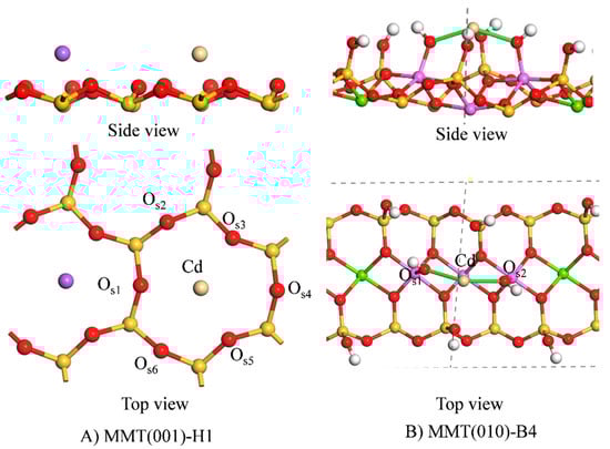 Figure 4B shows the most stable adsorption configuration of Cd2+ on the (010) surface, MMT(010)–B4. Cd2+ was adsorbed in the bridge position between two ≡Al-OH groups and formed covalent bonds with Os1 and Os2 on the (010) surface with bond lengths of 2.209 Å and 2.210 Å, respectively. This was mainly attributed to the substitution of Mg2+ with Al3+ in the AlO6 octahedron of montmorillonite, which leads to a high pH in the surrounding ≡Al-OH, thus increasing the activity of ≡Al-OH []. According to the Lewis acids and bases, transition metal ions similar to Cd2+, such as Cu2+, Zn2+, Ni2+, can coordinate with the surface via ≡Al-OH. Consequently, to improve the adsorption capacity of these cations, the hydroxyl groups on the (010) surface can be regulated by modifying the pH.