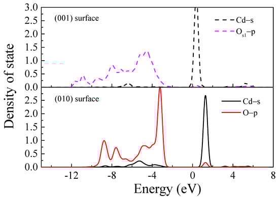 On the (010) surface, the Cd s orbital interacted with the Os1 p orbital at −2 to −10 eV to form the bond (mainly the Os1 p orbital), and the antibond was formed at 0.5–2 eV (mainly the Cd s orbital). The bonding strength was stronger than that of the antibond, and the covalence was strong, which resulted in a σ bond.