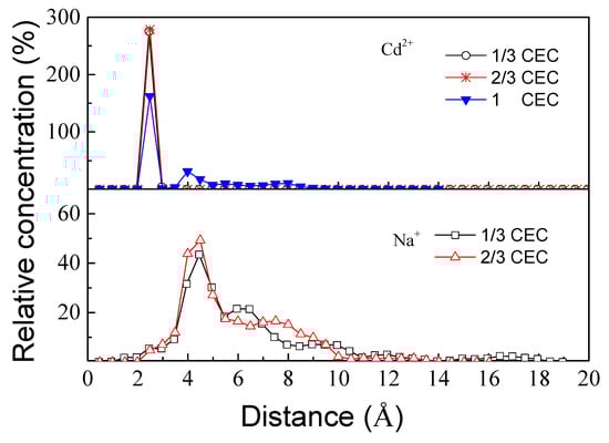 The (001) surface was mainly affected by the electrostatic adsorption of nearby cations to balance its negative charge due to lattice substitution. Figure 6 shows the relative concentration curves of Cd2+ and Na+ at the interface. At CEC values of 1/3 and 2/3, Cd2+ was mainly concentrated at the vicinity of 2.48 Å from the surface. When CEC increased to 1, the concentration of Cd2+ decreased at this distance and a secondary peak was formed close to 4.1 Å. When Na+ was replaced with Cd2+, Na+ was always distributed within 2.5–10 Å of the surface, and the concentration was mainly distributed at a distance of 4.5 Å. The interaction distance between Na+ and the surface was larger than that of Cd2+ and the surface; therefore, the interaction between Cd2+ and the surface was stronger than that between Na+ and the surface. Consequently, Cd2+ can easily replace Na+ and be adsorbed on the surface. Generally, divalent cations are adsorbed as inner-sphere surface complexes (IS) within 4 Å from the surface and as outer-sphere surface complexes (OS) beyond 4 Å []. Therefore, at CEC values of 1/3 and 2/3, the adsorption of Cd2+ on the surface was as IS due to the competitive adsorption between Cd2+ and Na+. Cd2+ attained a dominant position and had a stronger interaction with the surface. At a CEC of 1, part of the Cd2+ at the interface changed from IS to OS due to the competitive adsorption between Cd2+, which weakened the interaction between Cd2+ and the surface. In DFT calculations and without taking into consideration the water molecules, the adsorption distance between Cd2+ and the surface (001) was 1.1 Å, while by MD calculations, the presence of water molecules increased the adsorption distance to 2.48–4.1 Å. According to Peng et al. [], the adsorption of water molecules on the surface of montmorillonite mainly involves both electrostatic and hydrogen bond interactions. Therefore, the adsorption of water molecules on the surface weakens the electrostatic interaction of Cd2+, resulting in an increase in the adsorption distance.