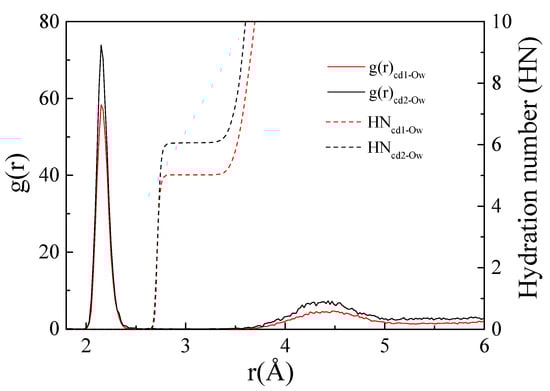 By analysing the radial distribution function between Cd2+ and the oxygen atom (Ow) of the interface water molecule, the hydration structure of the cation at the interface can be obtained. Figure 7 shows the radial distribution of Cd2+ and Ow at the montmorillonite interface. Cd1 represents IS, and Cd2 represents OS. The peak value of the radial distribution of Cd1-Ow was 2.15 Å, that is, the coordination distance (r) was 2.15 Å. The hydration number was 5.01. For Cd2-Ow, r was 2.15 Å and the hydration number of Cd2+ was 6.05. The hydration number of Cd2+ formed in bulk water is six, and rcd-O is 2.1–2.3 Å []. In general, hydration layers of approximately 10 Å thickness are present on the surface of clay minerals, and the molecular density of the hydration layer is greater than that of bulk water [,]. As the density of the interface hydration layer increases, the hydration number of Cd2+ adsorbed as OS becomes larger than that in the bulk phase. The change in the Cd2+ hydration number at the montmorillonite interface was mainly due to the stronger interaction between Cd2+ adsorbed by the inner sphere and the silica ring on the surface as compared to the interaction with water molecules. Consequently, the water molecules between the cations and the surface were squeezed out and reduced. When the inner sphere is converted to the outer sphere, the increase in distance weakens the interaction between Cd2+ and the surface, causing water molecules to enter between the surface and Cd2+ leading to an increase in the hydration number.