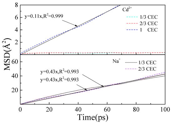 Diffusion coefficients can be obtained by fitting the mean-square displacement of cations at the interface [,]. As the diffusion coefficient increases, fewer ions are bound by surface adsorption allowing them to move away more easily from the surface and enter the water phase. Figure 8 shows the mean square displacements of Cd2+ and Na+ at the interface. When CEC was 1/3 and 2/3, the mean-square displacement of Cd2+ at the interface was within 0.3 Ų. The distribution was approximately horizontal and straight, so the diffusion coefficient was 0 m2/s, indicating that Cd2+ was firmly adsorbed on the (001) surface. At a CEC of 1, the diffusion coefficient became 1.83 × 10−10 m2/s, and this increase indicated that the adsorption between Cd2+ and the (001) surface was weakened. This was consistent with the analysis of the relative cation concentration. The diffusion coefficient of water in the bulk phase is 26 × 10−10 m2/s []. The diffusion coefficient of cations at the interface is much smaller than that of bulk water molecules, mainly due to the electrostatic attraction of cations on the surface and the binding of cations.