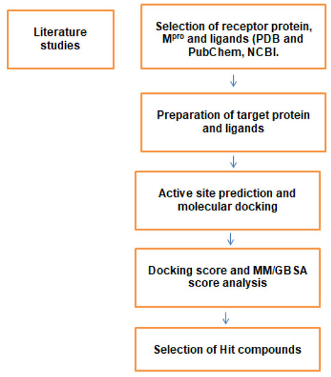 The search for drug components using bioinformatics tools is the topic of this research. The importance of bioinformatics and the structural determination has been demonstrated, not only for lead optimization, but also for lead discovery. Structural biology is integrated in the pharmaceutical industry’s drug development pipeline [45]. To identify starting points for their small-molecule R&D initiatives, pharmaceutical companies use high-throughput screening and fragment screening [46]. One technique for speeding up the standard drug development drug discovery process is drug repurposing. This will aid in understanding the reusability of novel therapeutic applications for compounds that have already been demonstrated to be safe and efficacious [47,48,49]. The increasing and faster spread of SARS-CoV-2, as well as the emergence of novel variants, highlight the importance of potential therapeutic components that serve as effective antivirals in controlling the pandemic. Interrupting the catalytic activity of Mpro could be useful in the development of anti-coronavirus therapeutics. With this background in mind, the current work sought to find a few phytocomponents capable of inhibiting the Mpro protein. In drug development, phytochemicals are being used as active drug components. Phytocompounds from a wide range of medicinal plants may help improve immune function and fight pathogens in the fight against viral diseases. Numerous studies have shown the importance of phytochemicals and their derivatives, which have antiviral activities, as well as their mode of action in the treatment of viral diseases [50,51,52]. In this study, six phytocompounds were identified to have significant interactions with the target protein, Mpro.. Docking-based binding affinity and stability studies were carried out to identify them. Figure 1 depicts the workflow of the various steps used in this study.