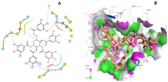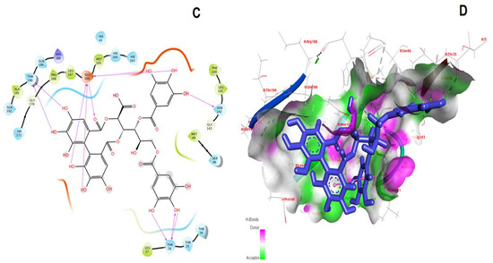 PGG is a polyphenolic molecule with anti-inflammatory, anti-diabetic, and enzymatic resistance characteristics [70,71]. This is one of the most potent antioxidants in the tannins group, and it has antibacterial and antiviral activities [72,73]. PGG may be a promising antiviral compound against the COVID-19 spike receptor-binding domain (RBD), according to a recent study [74]. PGG makes interactions with Leu141, Asn142, Glu166, Pro168, Thr169, and Gln189 in the binding pocket of Mpro. Figure 2A,B show the interaction between PGG and the target Mpro protein of SARS-CoV-2.