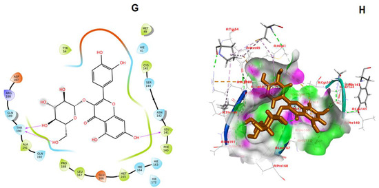 Only two residues, Leu141 and Thr190, formed interactions with Isoquercitrin. Isoquercitrin is a flavonoid found in fruit and vegetables and has antiviral properties against the human herpes and Zika virus [79,80]. This chemical has anti-inflammatory properties as well [81]. Figure 5G,H show the interaction between Isoquercitrin and the target Mpro protein of SARS-CoV-2.