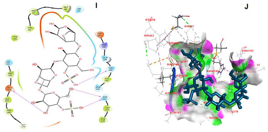 Kappa-Carrageenan interacts with Asn142, Glu166, and Thr190. Carrageenans are a type of linear sulfated polysaccharide that is discovered and isolated mostly from the cell walls of specific species of red seaweeds [82]. These polysaccharides show antiviral activity against a variety of viruses, including coronaviruses, dengue virus, and herpes simplex virus. Many studies have been conducted to investigate the role of Kappa-Carrageenan in influenza virus [83,84]. Kappa-Carrageenan has a 3,6-AG bridge and one sulfate ester group. Because of this, it is less hydrophilic and less soluble in water [85]. Figure 6I,J show the interaction between Kappa-Carrageenan and the target Mpro protein of SARS-CoV-2.