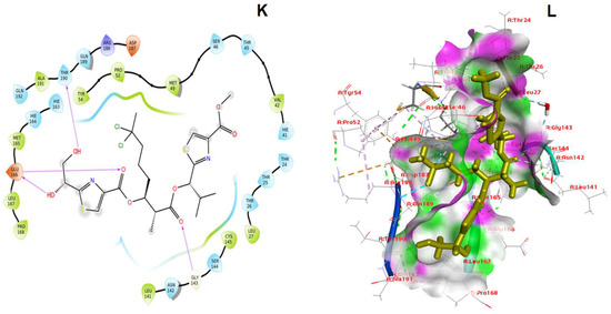 Dolabellin forms interactions with Gly143, Glu166, and Thr190. Dolabellin is a cytotoxic bisthiazole metabolite derived from the Sea Hare Dolabella auricularia [86].These compounds could be used in biological research since they have the potential to be used as therapeutic components. Many of the Dolabellin derivatives have pharmacological, toxicological, anti HIV and antimalarial characteristics [87,88]. Figure 7K,L show the interaction between Dolabellin and the target Mpro protein of SARS-CoV-2.