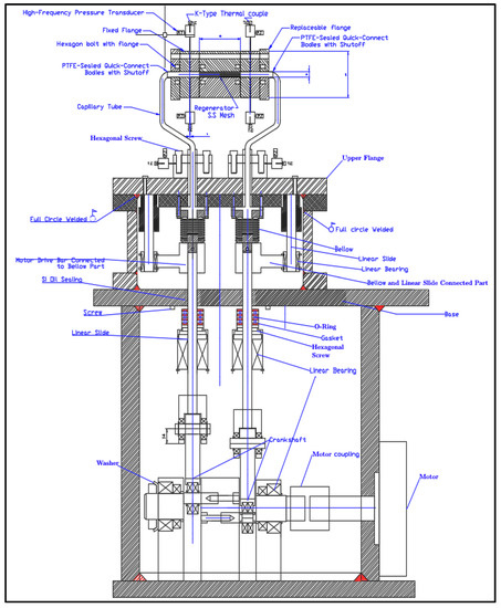 The regenerator is the most crucial part of the Stirling refrigerator because it acts as a heat exchanger in the system. The regenerator absorbs heat from the working gas when the gas flows from the hot end to the cold end and releases heat to fluid during the reverse cycle. The experimental test rig is shown in Figure 1. In this experimental device, the motor drives the crankshaft, and the crankshaft guides the bellows to compress and expand the gas so that it is an oscillatory bidirection flow system.