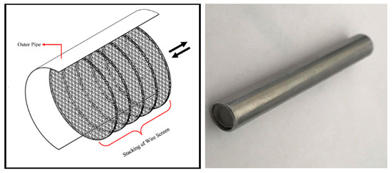 The heat exchanging media (matrix) is made of a light felt like a mass of fine wire stacked in a well-insulated tube, as shown in Figure 2. It shows the stacking of wire-mesh screens inside the regenerator. The fine wire mesh used in the regenerator is commonly obtained in the form of a woven screen at various wire sizes, weave structures, mesh densities, and materials. The wire screen is made of stainless steel, as it is easy to obtain, low cost, easy to process. In this experiment, two regenerators were selected, 200 mesh and 300 mesh. The prefix number used for mesh denotes the number of screens used in the regenerator. The length of the three regenerators is Lr = 45 mm, and the inner diameter is = 5 mm. The wire diameter and porosity of the regenerator are shown in Table 2. Figure 3 shows the location of pressure ports and regenerator fix block.