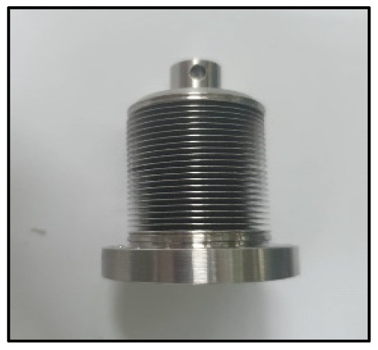 In this experiment, the function of the bellow is to compress and expand the working gas and withstand the pressure difference between the pressure chamber and the crankcase for a long time. The primary purpose of replacing the piston with a bellow in this experimental setup is to reduce the pressure loss due to leakage. The material used for the bellow is AMTM350. The material is chromium–nickel–molybdenum precipitation hardening stainless steel, as shown in Figure 4. The diameter of the bellow is 19 mm, and it has a stroke length of 16 mm. When the bellow is at the top dead center, the maximum volume is calculated to be 11.9 cc, and the minimum volume when the bellows are at the bottom dead center is estimated to be 7.26 cc. The sweeping volume is calculated through AutoCAD and found to be 4.64 cc, and the dead zone volume is 0.13 cc.