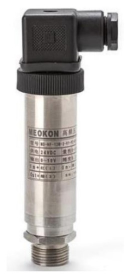 The pressure gradient at the inlet and outlet of the regenerator is measured by pressure transducers from Meokon Sensor Technology, Shanghai, China, and its model is MD-HF, shown in Figure 5. The pressure range is 0–3 MPa with an accuracy of 0.5%. The highest response frequency can reach 200 kHz. The flow data are extracted through the data acquisition module, and the motor speed can be found using the motor servo. The fluid oscillates from the hot end to the cold end. In order to measure the temperature difference inside the regenerator, a k-type thermocouple is used. The cold-end part of the regenerator uses air as natural convection for heat dissipation. The pipe is partially covered with insulation material to prevent excessive heat loss. A fixed block is used to hold the regenerator. In order to know the errors occurring in the experiment, a leak test is performed before the start of experiments, and it is found that the leakage mainly includes small cracks through welding parts and uneven screw locking. The leakages are found using a helium leak detector (Model Phoenix L300I, Leybold GmbH, Cologne, Germany). It consists of a probe used to check the helium leakage maximum up to 10−10 bar. There is a display that shows the graph. If there is any leakage, then it shows deflection, and the buzzer sound will instantly change to a high pitch. Once the causes of the leakage are known, the experiments are performed by preventing the causes, leading to leakage.