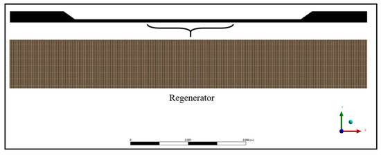 To simplify the case and reduce computational time, the flow can be assumed to be 2D axisymmetric as the flow variations are more significant in both axial and radial directions only. The 2D model for CFD simulation is modeled using an Ansys Design Modeler, and a schematic diagram of the computational geometry is shown in Figure 6. The design consists of three main parts: hot- and cold-end bellow, regenerator, and pipe for flow to achieve entrance length. A uniform quadrilateral mesh of elements has been developed, and it is shown in Figure 7, which is a zoom of the mesh structure for a clear visibility of the mesh. After a thorough grid-independent test, it is found that a further increment in the number of grids does not have any effect on the results. Figure 8 shows the boundary conditions used in the numerical study. No slip boundary condition is used for all the walls of the bellows, regenerator, and pipe. The oscillatory velocity boundary conditions are realized at the hot end and cold-end bellows through a user-defined function where the axial velocity, , is specified as , where L is the swept length and is the angular frequency of the bellow.