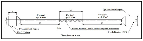 The flow is assumed to be 2D axisymmetric, unsteady, and incompressible as the Mach number is less than 0.3, and also, isothermal conditions are used in this study as the present study aims to predict only the hydrodynamic characteristics of the regenerator. Hence, the two-dimensional unsteady governing Equations (4)–(6) in the polar coordinate system are considered. In the momentum Equations (5) and (6), source terms are added in order to incorporate the effects of porosity. Helium is used as a working fluid at an operating pressure of 6 bars. The oscillatory motion is achieved using a dynamic mesh model. A user-defined function has been developed to define the bellow motion using Ansys C programming libraries. The velocity of the bellow is defined in Equations (7) and (8). A phase difference of is used between two bellows so that one bellow will undergo compression when the other one is undergoing an expansion phase. The flow-governing equations, including continuity and momentum equations, are as follows [40,41]: