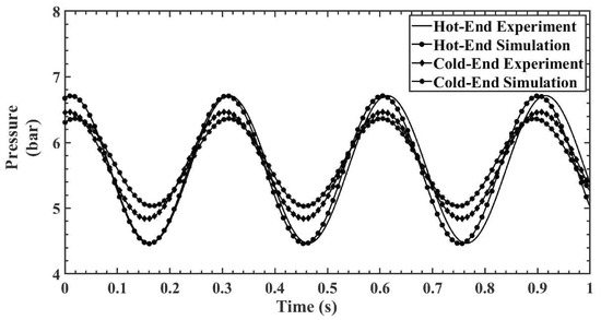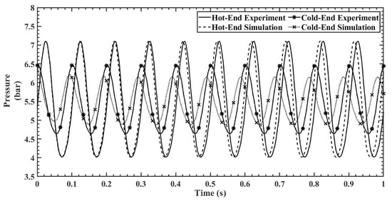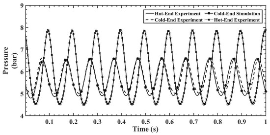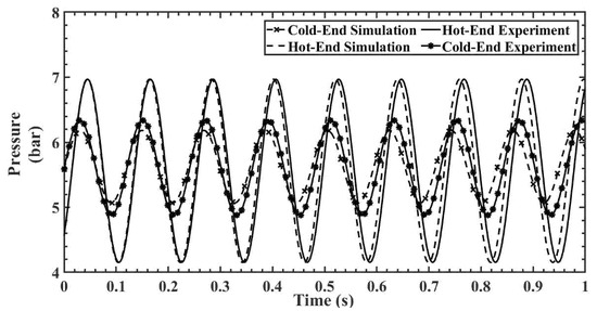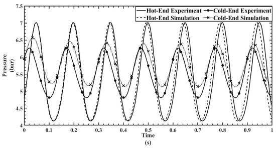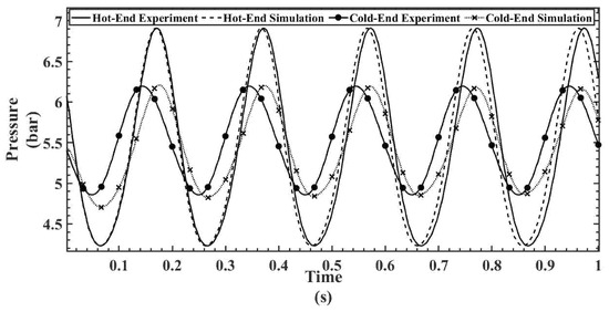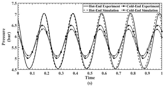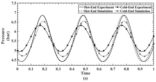 Figure 9, Figure 10, Figure 11, Figure 12 and Figure 13 show the hot- and cold-section pressure characteristics of both experiment and CFD data for a 300 mesh regenerator, and Figure 14, Figure 15, Figure 16, Figure 17 and Figure 18 show the pressure characteristics of a 200 mesh regenerator. In Figure 9, for the 300 mesh regenerator, it can be inferred that the cold-end pressure has a specific time lag with the experimental results. The numerically estimated maximum and minimum pressures deviate by 0.1% and 4.4% from experimental results along with this time lag. As the operating frequency increases from Figure 10, Figure 11, Figure 12 and Figure 13, the time lag between the experimental and numerical results vanishes, and also, the error in deviation of the maximum pressure is reduced to 2%. It can also be inferred that as the flow time increases, the error rises in the numerical result.