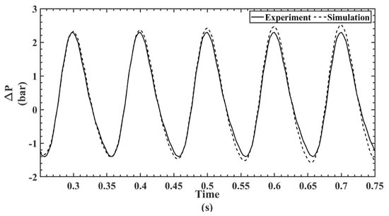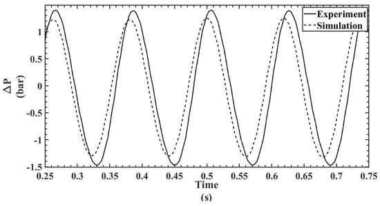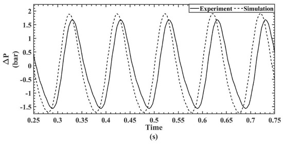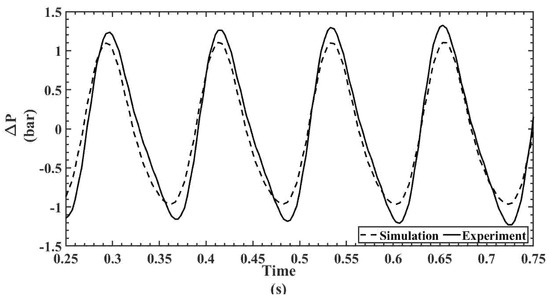 The temporal pressure drop is calculated for all the cases from the pressure values obtained at both the hot and cold sections, as discussed in the previous section. The pressure drop is calculated by estimating the pressure difference between hot end and cold end for both experimental and numerical studies. For the sake of clarity and to avoid duplication, the pressure drop plots are shown only at two piston speeds for both regenerators since the temporal pressure variations are already shown in Figure 9, Figure 10, Figure 11, Figure 12, Figure 13, Figure 14, Figure 15, Figure 16, Figure 17 and Figure 18. Figure 19 and Figure 20 show the temporal pressure drop characteristics for the 300 mesh regenerator at piston speeds of 600 and 500 RPM, respectively. Similarly, Figure 21 and Figure 22 show the temporal pressure drop characteristics for the 200 mesh regenerator at piston speeds of 600 and 500 RPM, respectively.