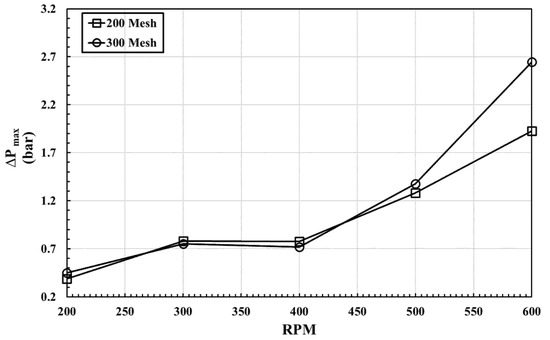 Comparing the pressure drop of 300 mesh and 200 mesh regenerators, it can be seen that the 300 mesh regenerator has a higher pressure drop. Therefore, it is clear that pressure drop is increased with an increase in porosity, and also, for both 300 and 200 mesh regenerators, the numerically obtained pressure drop is found to be reasonably in good agreement with the experimental results. The variation is more for 200 mesh regenerator cases. The maximum pressure drop values are also estimated for various Reynolds numbers based on the piston speed and plotted in Figure 23. It is observed that the maximum pressure drop increases with the bellow speed. However, the effect of porosity on pressure drop is clearly seen at higher bellow speeds, whereas it is less dominant at lower speeds.
