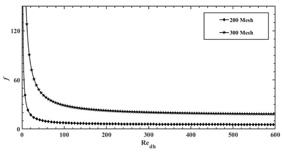 Substituting the known values of viscous resistance, inertial resistance, and hydraulic diameter, the friction factors for 200 mesh and 300 mesh regenerators are obtained and shown in Equations (15) and (16), respectively.