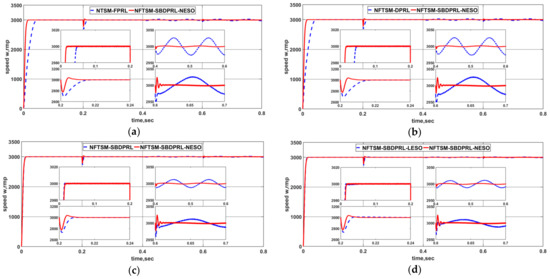 Response curves of the PMSM under NFTSM-SBDPRL-NESO and the other four control methods for comparison: (a) NTSM-FPRL and NFTSM-SBDPRL-NESO, (b) NFTSM-DPRL and NFTSM-SBDPRL-NESO, (c) NFTSM-SBDPRL and NFTSM-SBDPRL-NESO, (d) NFTSM-SBDPRL-LESO and NFTSM-SBDPRL-NESO.