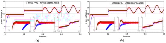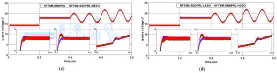 Control signals (q-axis voltage) of the PMSM under the five control methods for comparison: (a) NTSM-FPRL and NFTSM-SBDPRL-NESO, (b) NFTSM-DPRL and NFTSM-SBDPRL-NESO, (c) NFTSM-SBDPRL and NFTSM-SBDPRL-NESO, (d) NFTSM-SBDPRL-LESO and NFTSM-SBDPRL-NESO.