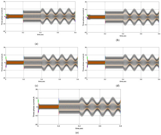 Three-phase currents of the PMSM under the five control methods for comparison: (a) NTSM-FPRL, (b) NFTSM-DPRL, (c) NFTSM-SBDPRL, (d) NFTSM-SBDPRL-LESO, (e) NFTSM-SBDPRL-NESO.