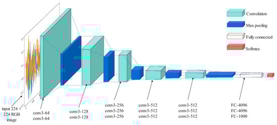 Current mainstream CNN models include AlexNet, GoogLeNet and the VGG network. Among them, the VGG network proposed by the Visual Geometry Group of Oxford University in 2014 is a neural network applied in image classification and recognition, with excellent feature extraction capabilities. The network contains 13 convolutional layers and 3 fully connected layers. VGG stacks multiple convolution kernels to replace the large convolution kernels in traditional neural networks. Multiple convolution kernels effectively expand the number of channels. The pooling layer is used to reduce the width and height, making the constructed neural network more efficient, deeper, wider and less computationally intensive for large-scale neural networks [33]. The VGG network uses the ReLU function as the activation function. Unlike the Tanh and Sigmoid functions, the ReLU function is an unsaturated function, which means that it does not reduce the error of backpropagation, and the network converges faster, which can considerably reduce the training time. Based on these advantages, the fault diagnosis model uses the VGG network structure, which is shown in Figure 1.