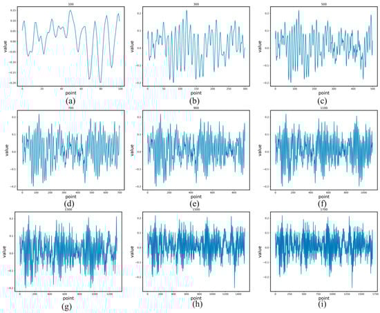 For determination of data length, the data are not processed, and 2D images are drawn directly by the matplotlib function. The obtained datasets are shown in Table 1, and 9 signals of different lengths are shown in Figure 2. A total of 9 groups of datasets of different lengths are tested, i.e., 100, 300, 500, 700, 900, 1100, 1300, 1500 and 1700. The number of datasets constructed by 9 different sample lengths is the same, and the specific number is given in Table 1. The number of concrete can be divided into 10 categories: normal; inner race, 0.007 mils; ball, 0.007 mils; outer race, 0.007 mils; inner race, 0.014 mils; ball, 0.014 mils; outer race, 0.014 mils; inner race, 0.021 mils; ball, 0.021 mils; outer race, 0.021 mils.