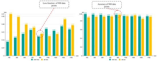 Nine single-channel datasets of different lengths were trained using convolutional neural network training. The data length of a single sample in all subsequent experiments presented in this paper was ultimately determined according to the training results of single-channel DE datasets and the accuracy of bearing fault diagnosis of the obtained model. Figure 3 shows the training results; the precision of training increases with an increased number of data points. However, when a single sample contains more than 900 data points, the precision of the model declines, and loss function values begin to change. Therefore, 900 data points were chosen as a sample.