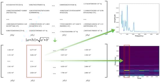 The result of Fourier transform of each window is a complex two-dimensional matrix; each column of this matrix is the spectrum of a window, and the number of columns in the matrix is equal to the number of segments of the signal divided by the window. This is used to determine the magnitude of the complex number to obtain the real amplitude value; then, the color block is used to represent the amplitude of each column. The higher the amplitude, the brighter the color block, and the lower the amplitude, the darker the color block, the specific operation process is shown in Figure 6.