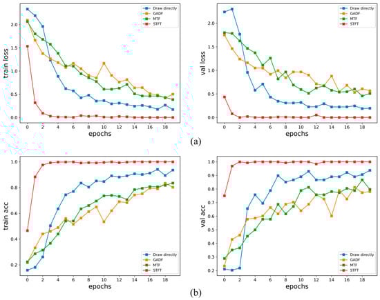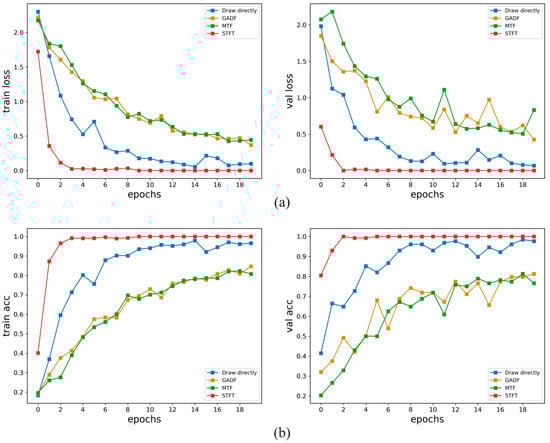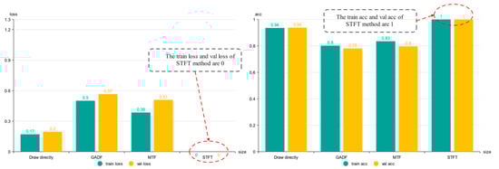 In the single-channel data test, the method of using the STFT to generate the spectrum map achieved good results in fault identification of the 1D vibration signal. In order to verify the effectiveness of this method in multichannel data, DE and FE dual-channel data are used to generate datasets for training. In the dual-channel experiment, three different 2D methods—the direct rendering method, GADF method and MTF method—were also used for comparison, and the number of samples was the same as that of the single channel. The training results using the dual-channel data are shown in Figure 14. In part (a) of the figure, the loss function values of the model in the training set and the validation set are shown, and part (b) shows the accuracy values of the training set and the validation set. Compared with the single-channel dataset, the accuracy of the VGG network training obtained by direct rendering method, GADF method, MTF method and STFT method was been improved, and STFT still performed best in VGG.